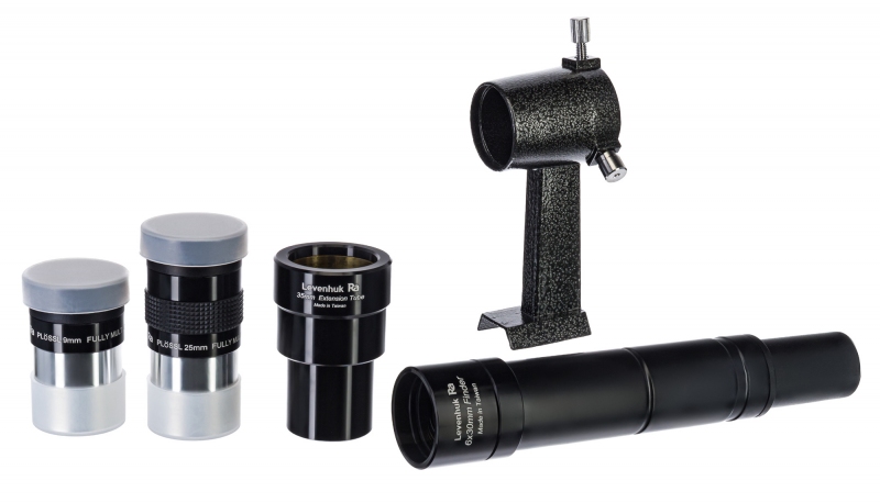 Součástí sady jsou dva symetrické okuláry: 9 mm a 25 mm. Zajišťují dobrý obraz a umožňují rychle začít studovat hvězdnou oblohu. Hledání astronomických objektů se provádí pomocí optického hledáčku 6x30 mm.